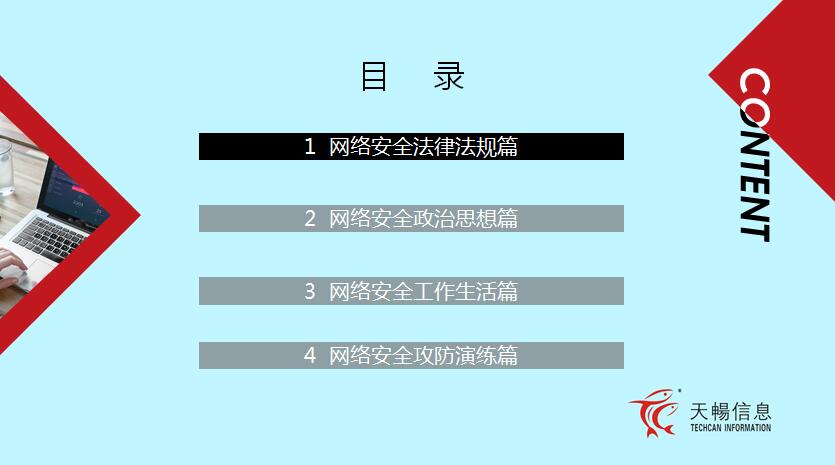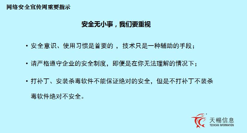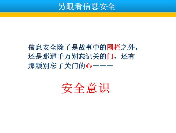 随着信息技术爆炸式的不断发展,给我们带来了生活和工作的便利,但同时也带来了相应的网络安全问题。对于网络传输的信息安全,除了要重视防黑客、反病毒、加密技术等多方面,实际上更应该关注网络安全管理问题、法律政策问题和网络安全意识培训问题。在信息高速发展的时代,任何安全故障最终都归结到了人的问题,而网络和信息安全意识的培养是至关重要的,企业的稳定发展自然离不开网络安全知识的培训。