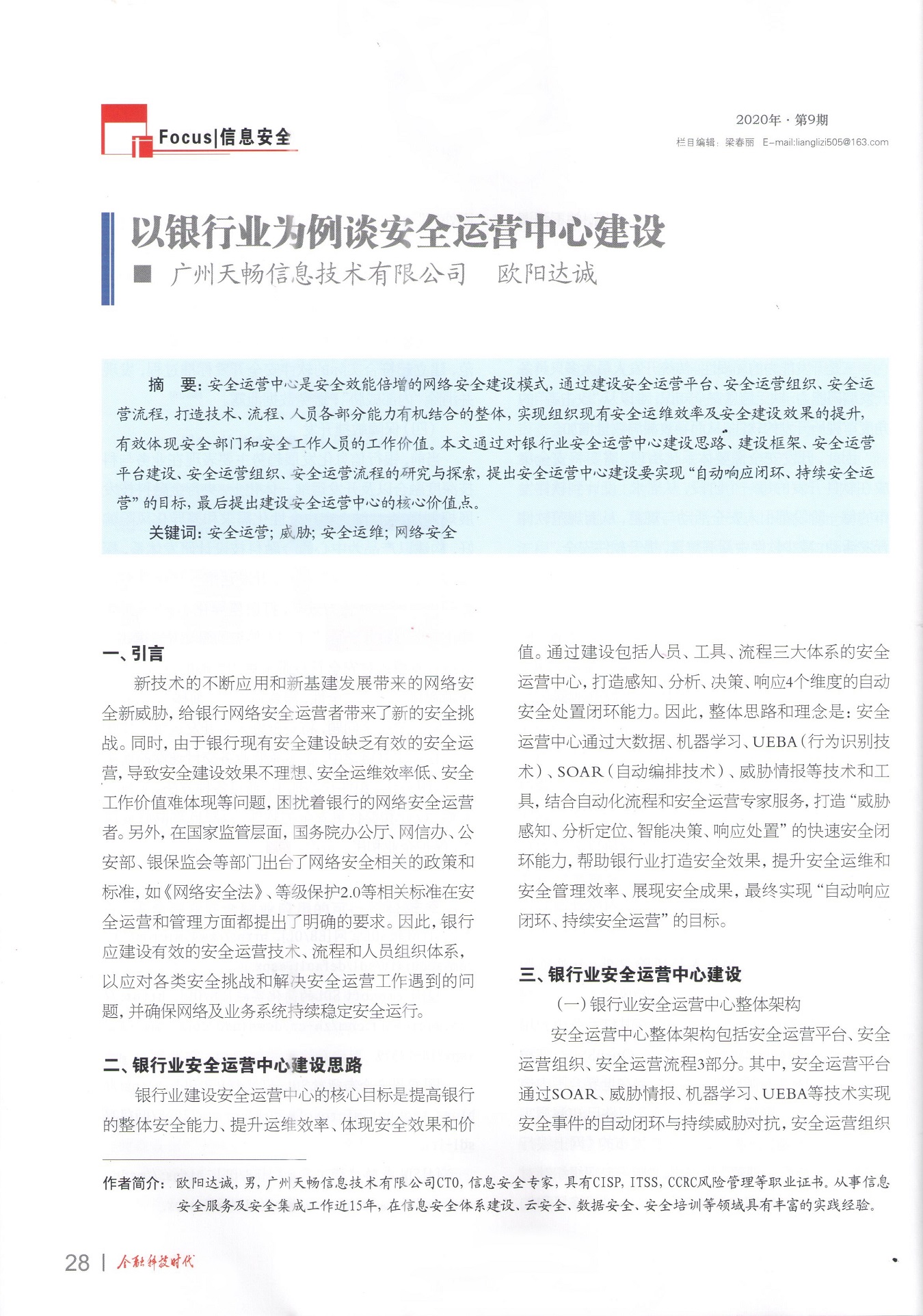 《金融科技时代》杂志(2020年第9期)发表了欧阳达诚的署名文章《以银行为例谈安全运营中心建设》。文章通过对银行业安全运营中心建设思路、建设框架、安全运营平台建设、安全运营组织、安全运营流程的研究与探索,提出安全运营中心建设要实现“自动响应闭环、持续安全运营”的目标,最后提出建设安全运营中心的核心价值点。