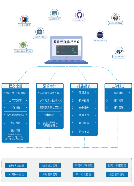 开发安全检测工具之源代码缺陷审计平台真正将代码审核工作融入了客户现有的软件开发及测试流程,实现了源代码安全漏洞扫描、无源码Jar包扫描、第三方开源组件扫描及代码质量检测。