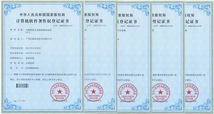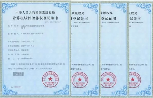 近日,广州天畅信息技术有限公司开发的 “安全运维管理平台”、“终端安全管理系统”、“安全策略统一管理系统”、“智能化数据统计分析平台”、“APT攻击监测与防护系统”等九项软件著作获国家版权局颁发软件著作权证书。
