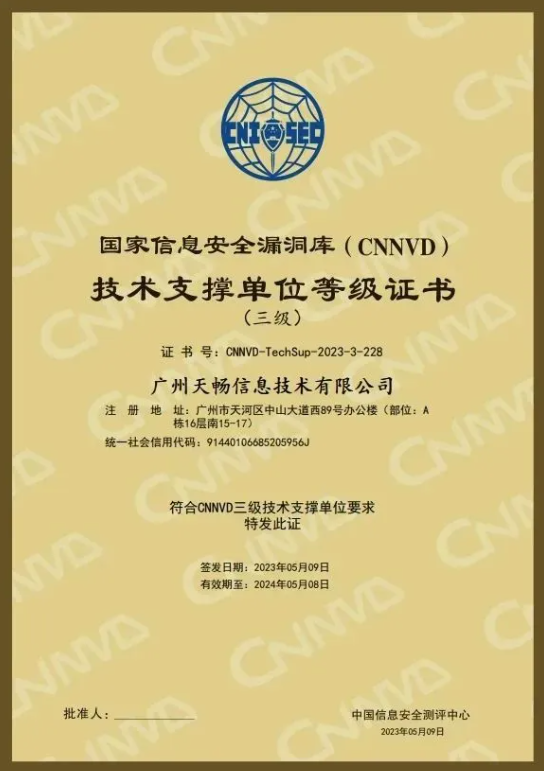 获得CNNVD漏洞技术支撑单位资质证书是广州天畅信息技术有限公司在网络安全领域稳步发展的又一重要里程碑。未来,我们将继续致力于网络安全创新与优化,为客户提供更加专业化、高效的安全服务,为网络安全事业的发展做出更大的贡献。我们希望通过自身的努力,为推动网络安全事业的发展做出积极的贡献,为用户提供更加安全、可靠的网络环境。