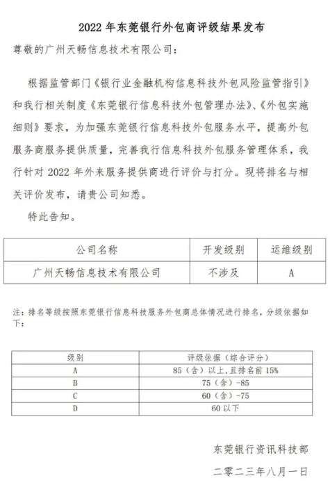近日,根据监管部门《银行业金融机构信息科技外包风险监管指引》和《东莞银行信息科技外包管理办法》、《外包实施细则》要求,东莞银行针对2022年外来服务提供商进行评价与打分。广州天畅信息技术有限公司(简称:天畅信息)获得东莞银行2022年外包商运维A级评价。