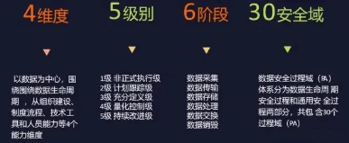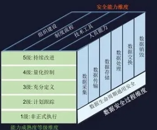 DSMM借鉴能力成熟度模型(CMM)的思想,将数据按照其生命周期分阶段采用不同的能力评估等级,从组织建设、制度流程、技术工具、人员能力四个安全能力维度的建设进行综合考量。将数据安全成熟度划分成了1-5个等级,为企业提供了明确的数据安全管理框架和指导。