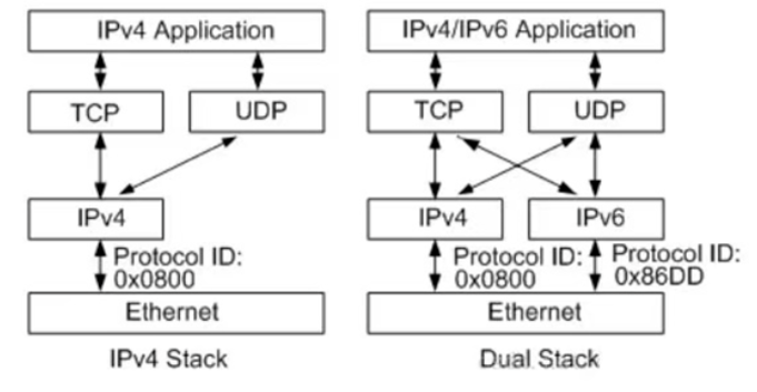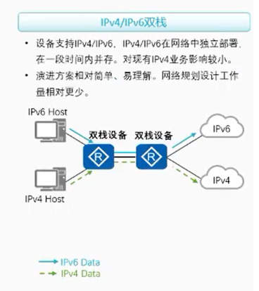 网络中的设备同时支持IPv4和IPv6协议栈,源节点根据目的节点的不同选用不同的协议栈,而网络设备根据报文的协议类型选择不同的协议栈进行处理和转发。双栈可以在一个单一的设备上实现,也可以是一个双栈骨干网。对于双栈骨干网,其中的所有设备必须同时支持IPv4/IPv6协议栈,连接双栈网络的接口必须同时配置IPv4地址和IPv6地址。所谓的双栈就是主机或者网络设备同时支持IPv4及IPv6双协议栈,如果节点支持双栈,那么它能够同时使用V4和V6的协议栈、同时处理IPv4及IPv6的数据。在双栈设备上,上层应用会优先选择IPv6协议栈,而不是IPv4。
