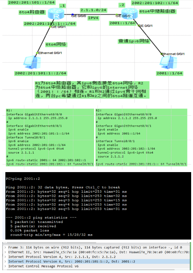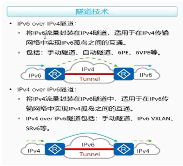 (2)通过隧道技术,使用IPv6报文在IPv4网络中传输