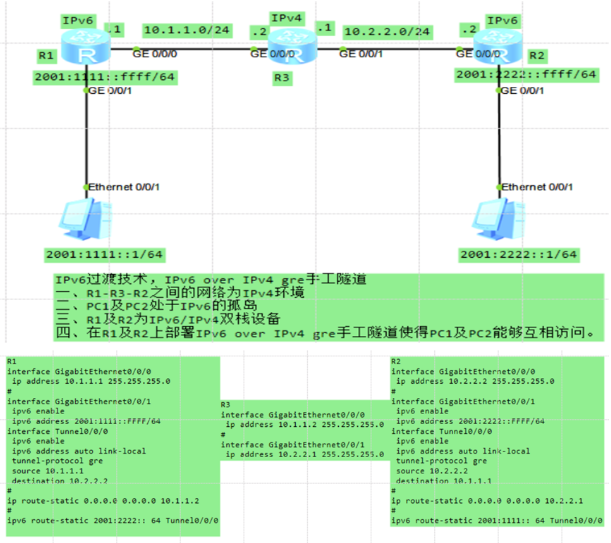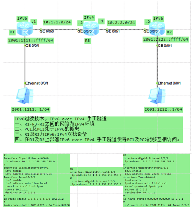 (3)手动隧道包括IPv6 over IPv4手动隧道和IPv6 over IPv4 GRE隧道
