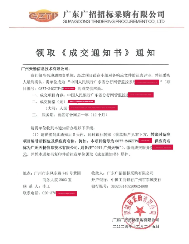 近日,经过中国人民银行广东省分行项目采购磋商小组对各响应文件的认真评审,并经采购中心最终确认,广州天畅信息技术有限公司(简称:天畅信息)成为“中国人民银行广东省分行网管监控系统服务项目”的成交供应商。